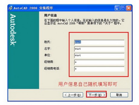 CAD的用戶信息自己隨意填寫即可 填寫完畢后點(diǎn)擊“下一步”按鈕,如上圖所示: