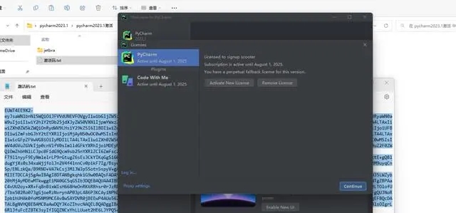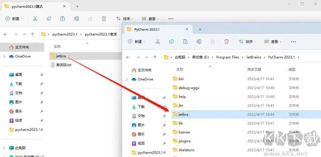 10、解壓下載得到的“Pycharm2023.1激活.zip”,進(jìn)入文件夾,里面有個“jetbra”文件夾和一個“激活碼.txt”文件,把jetbra文件夾復(fù)制到某個沒有中文且沒有其他非法字符的路徑下,注意,以后不能修改它的位置,否則激活失效。比如說我這里把它復(fù)制到Pycharm的安裝目錄下