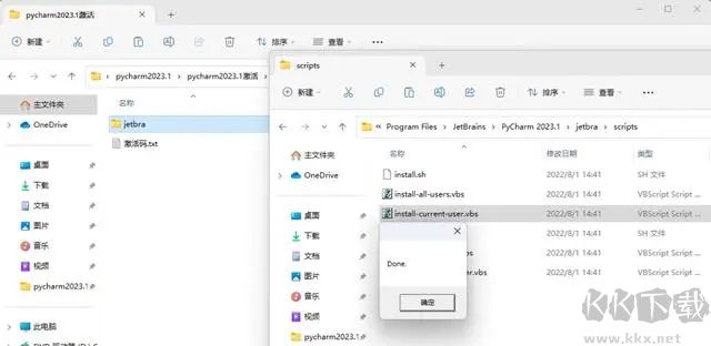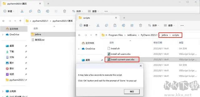 11、進(jìn)入復(fù)制后的jetbra文件里的scripts文件夾,里面有個install-current-user.vbs,雙擊運行它,點擊確定按鈕