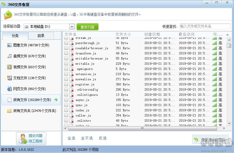 360文件恢復是360安全衛(wèi)士中一項非常實用的功能,目前并未獨立開放下載,當然360文件恢復有不錯的恢復能力,如誤刪除文件,清空回收站、格式化等都可以掃描后恢復。支持硬盤、U盤、Sd卡等等,本站提供的是360文件恢復2019獨立版(單文件),大家可隨身攜帶使用。