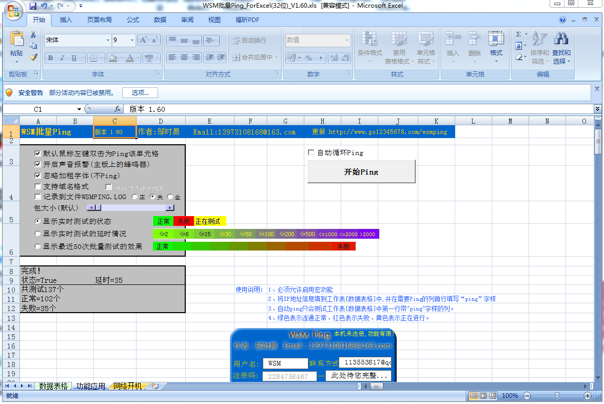 WSM批量Ping ForExcel是一款基于Excel開發(fā)的批量ping工具,軟件最主要的功能是批量ping ip地址檢測網(wǎng)絡(luò)連通狀況,具有錄入信息方便無須轉(zhuǎn)換、批量檢查速度奇快。