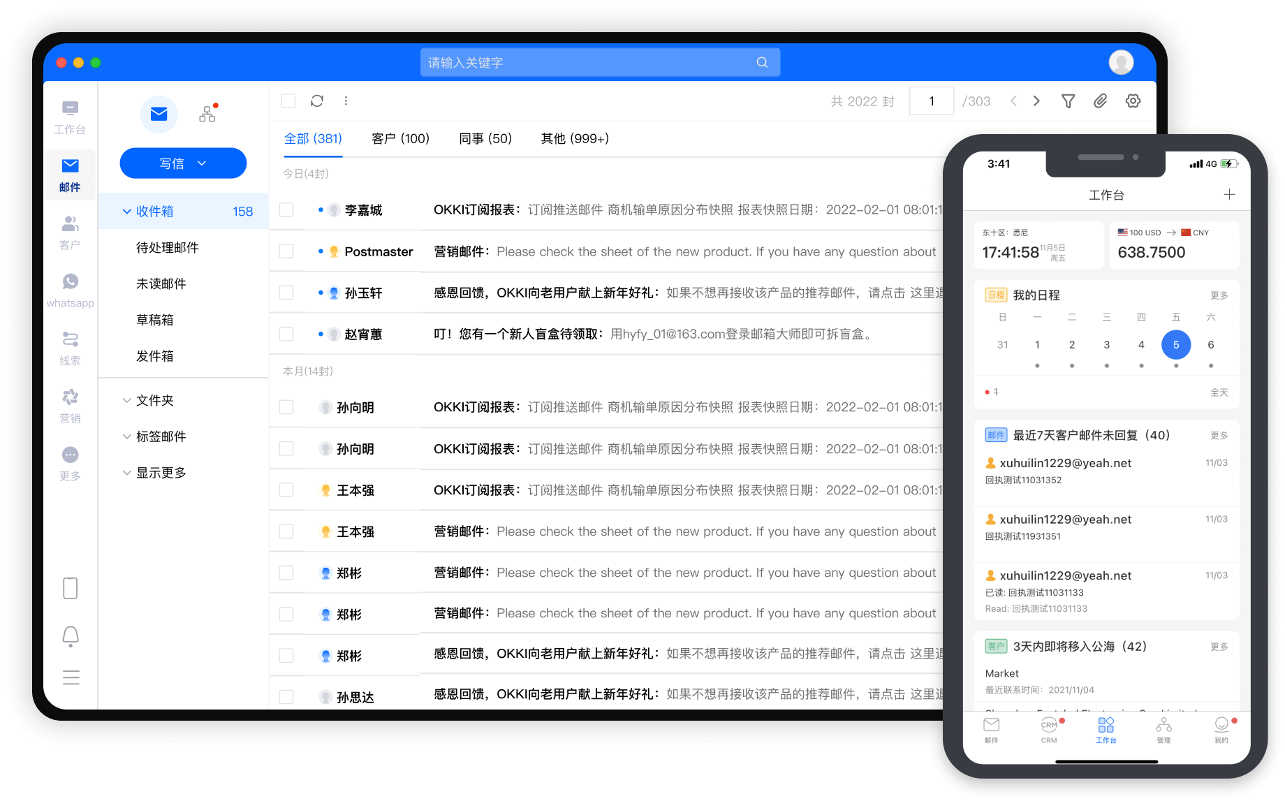 郵件數(shù)據(jù)多端實(shí)時(shí)同步更新,新郵件提醒,及時(shí)回復(fù)客戶(hù)郵件,鎖定每一個(gè)商機(jī);聯(lián)系人卡片,幫助快速識(shí)別客戶(hù)類(lèi)型,聚合往來(lái)郵件,轉(zhuǎn)化郵件線索。