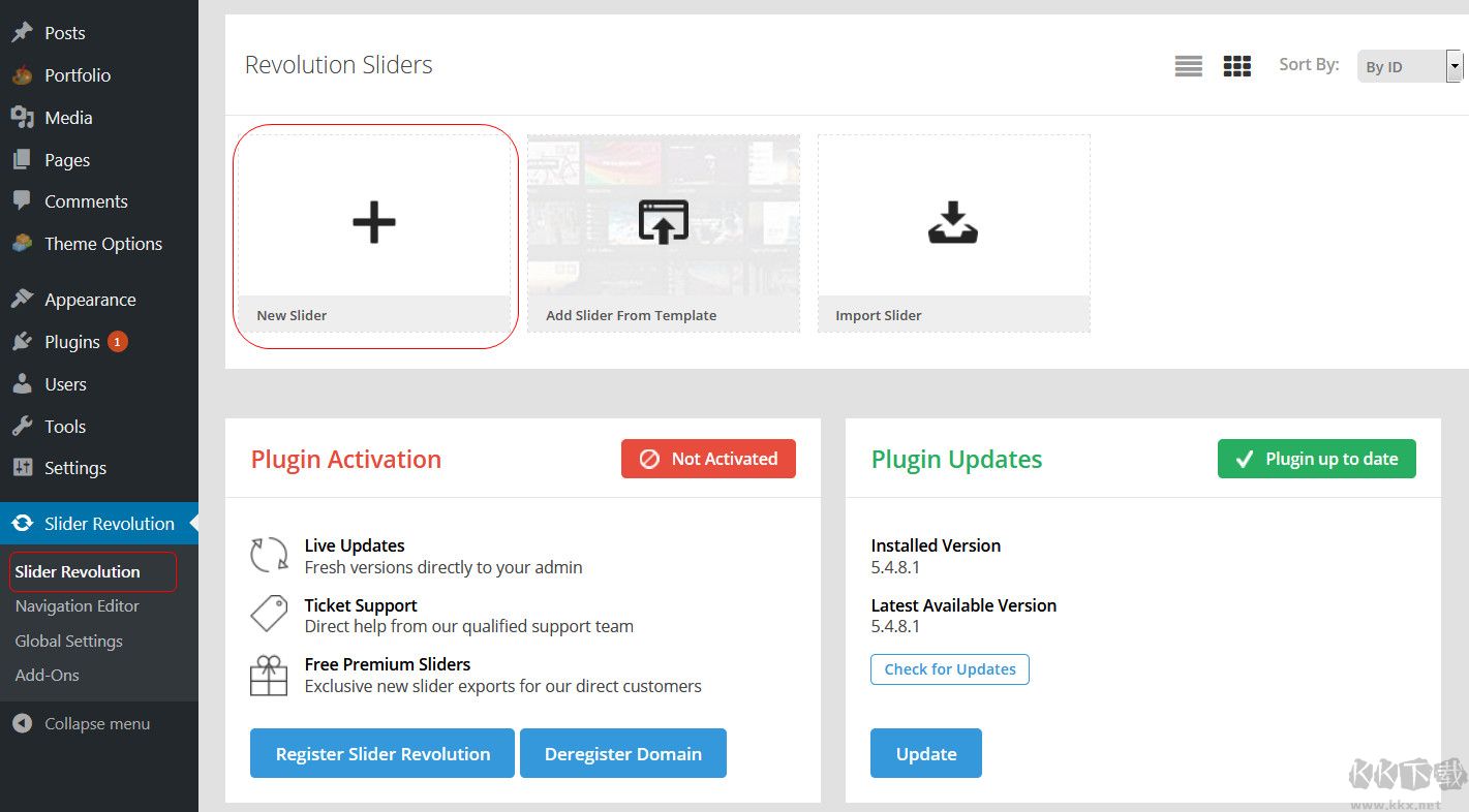 在wordpress后臺,點擊“slider revolution”,然后點擊“New slider”。