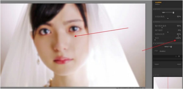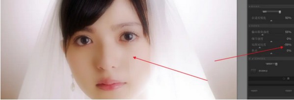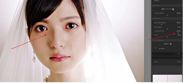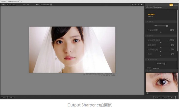 2、第二個(gè)滑塊為銳化區(qū)域和銳化邊緣,顧名思義,往左滑動(dòng)是對(duì)畫(huà)面的大塊區(qū)域進(jìn)行銳化,比如圖中的臉,而向右滑則是對(duì)畫(huà)面邊緣的部分進(jìn)行銳化,比如圖中婚紗的外輪廓。