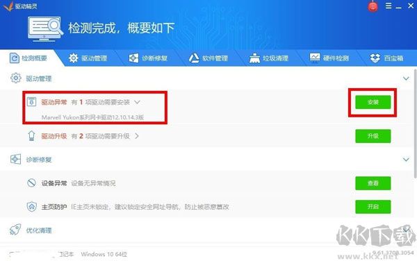3、等待軟件檢測(cè)完成,完成后在列表中就會(huì)顯示驅(qū)動(dòng)異常,提示網(wǎng)卡缺少驅(qū)動(dòng),點(diǎn)擊后方的安裝選項(xiàng)。