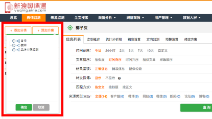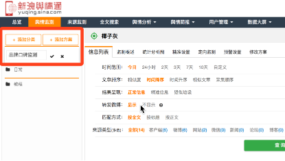 接下來,就可以開始設(shè)置監(jiān)測(cè)方案了,點(diǎn)擊“添加方案”,在彈出的分類列表框內(nèi)選擇對(duì)應(yīng)的分類,點(diǎn)擊確定即可。其中,本處選擇“品牌口碑監(jiān)測(cè)”。