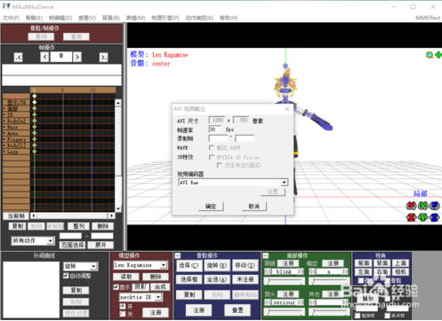 然后按“文件”,然后按“生成AVI視頻”,會彈出“avi視頻輸出”,在錄制楨一定要把首楨和尾楨添加進(jìn)去,首楨一般填“0”,尾楨可以在“骨骼/楨操作”那里查看。之后就可以導(dǎo)出視頻了。