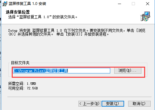 2、進入安裝位置選擇界面,您可以點擊【安裝】軟件會默認安裝,或者您可以點擊【瀏覽】在打開的選擇安裝位置界面中,您可以自行選擇藍屏修復工具的安裝位置,選擇完成后點擊【安裝】就可以了;