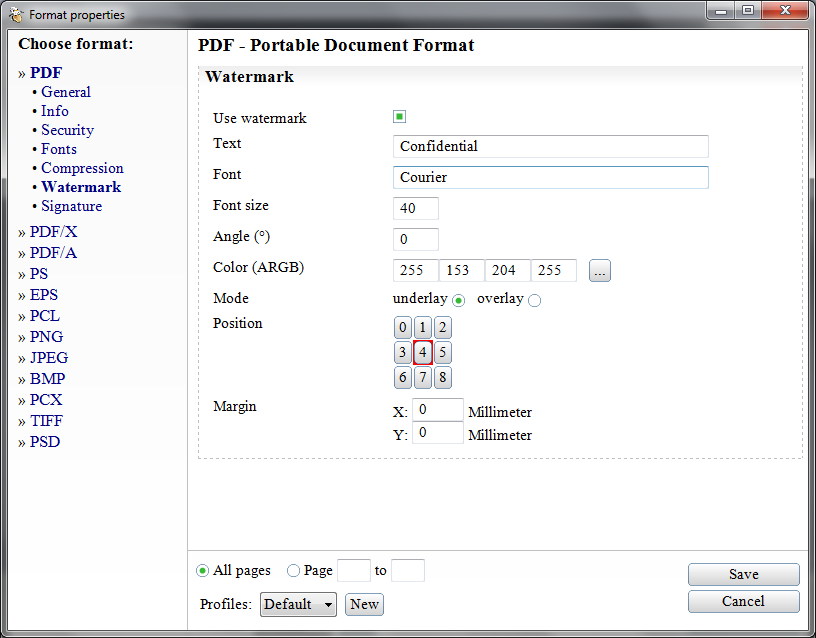 提供PDF元數(shù)據(jù)、密碼安全、壓縮和分辨率、水印和頁(yè)碼、底層和疊加層、附加、簽名等選項(xiàng)。