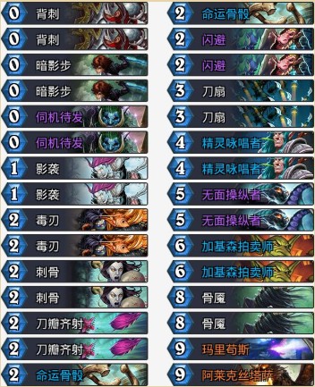 這套是藍(lán)龍賊,卡組的思路很簡(jiǎn)單,用精靈詠唱者過(guò)濾隨從,把藍(lán)龍雙無(wú)面摸到手上就可以了。其次刀瓣、影襲,刺骨等牌隨便來(lái)兩張都能超過(guò)30血斬殺,前期還有紅龍可以直接打15血,配合斬殺,經(jīng)過(guò)實(shí)驗(yàn)牌序順的話5費(fèi)不要基本就贏了。