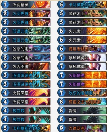 元素體系厲害的就是戰(zhàn)吼,這個(gè)亂斗開(kāi)始之后其實(shí)第一反應(yīng)就想到了元素。元素高額的直傷配合回手繼續(xù)輸出的效果可以讓我們的場(chǎng)面不再那么死板。剛剛提到的鋪場(chǎng)術(shù)士就很容易一波場(chǎng)面被清掉,但是元素的效果實(shí)打?qū)嵉陌褌Υ虻綌橙四樕狭恕E浜险訚捎问幷?,撼世者等的拿回效果以及低語(yǔ)元素的雙戰(zhàn)吼效果,我們的斬殺對(duì)手很難防。這里加入了一張沙德沃克,戰(zhàn)吼效果有一些隨機(jī),有時(shí)候能救一命!