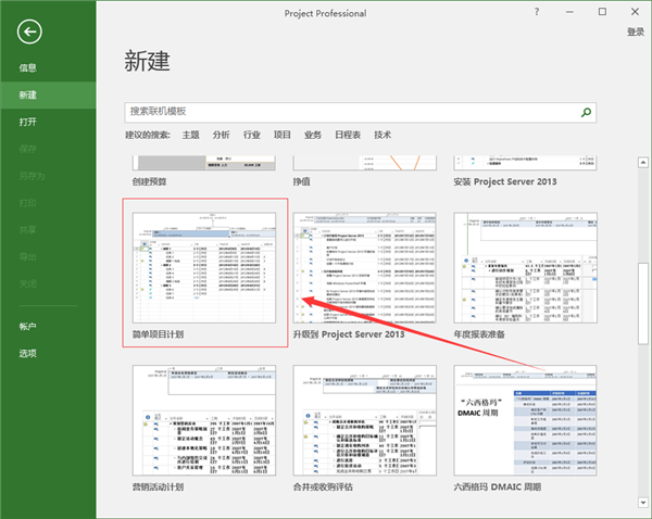 首先打開Project 2016,然后選擇新建--所需的模板項目文檔(以簡單項目計劃為例,如圖一)