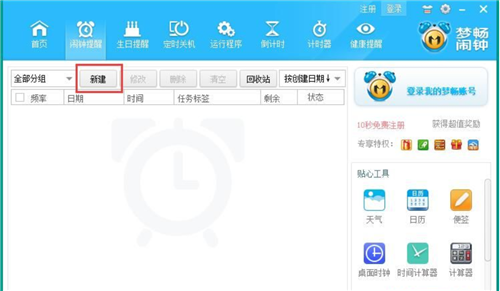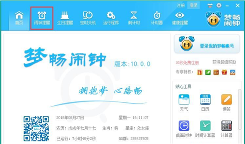 1、點(diǎn)擊夢(mèng)暢電腦鬧鐘主界面功能欄中的鬧鐘提醒,打開鬧鐘管理窗口;