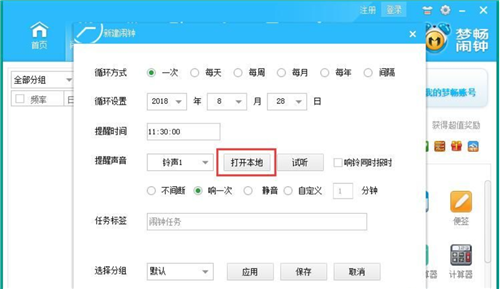 4、小編選擇了鬧鐘循環(huán)1次,在2018年8月18日的早上11:30響鈴。夢(mèng)暢電腦鬧鐘有默認(rèn)的鬧鐘鈴聲,同時(shí)也支持我們自定義設(shè)置鬧鐘鈴聲。點(diǎn)擊打打開本地,打開文件瀏覽窗口,選擇想要用來作為鈴聲的音頻文件;