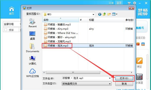 5、在文件瀏覽窗口中,根據(jù)MP3音頻文件的存放路徑,找到想要用作鬧鐘鈴聲的MP3音頻文件。點(diǎn)擊選中文件后點(diǎn)擊打開,就可以將選中的MP3音樂添加到夢(mèng)暢電腦鬧鐘中作為鬧鐘鈴聲了;