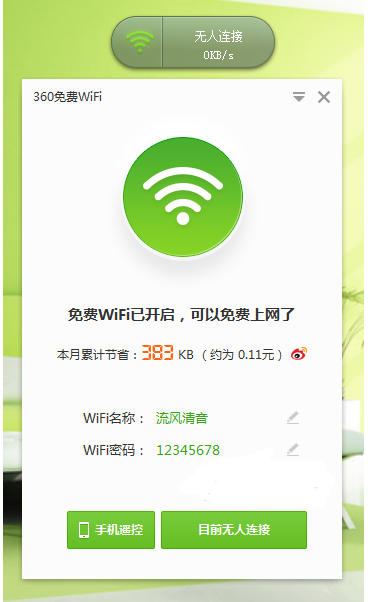 360WiFi是一款免費(fèi)WIFI軟件,安裝在你的電腦上就可以分享無線給邊上的手機(jī)、電腦、平板等設(shè)備了!使用用戶非常多,節(jié)省了買路由器的錢,并且完美支持校園網(wǎng),同時(shí)360WIFI還具有使用簡(jiǎn)單,安全,防蹭網(wǎng)等眾多功能,趕緊下載體驗(yàn)吧!