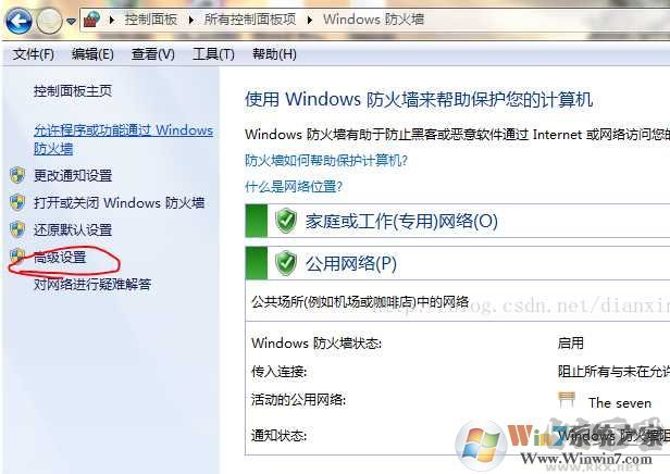 1、通過(guò)防火墻可以直接關(guān)閉的,很簡(jiǎn)單,在控制面板的“Windows 防火墻”頁(yè)面左側(cè)找到“高級(jí)設(shè)置”打開。