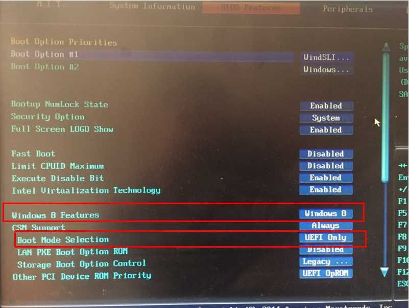 2、如下圖,將Windows8 features 設置為Windows8 將 Boot Mode Selection 設置為 UEFI Only ;