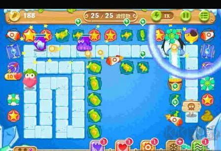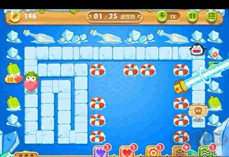 2、選擇升級的炮塔是很關(guān)鍵的,玩家在游戲的前期需要升級的有火箭炮和冰錐塔來保證小怪不會(huì)侵犯到蘿卜,同時(shí)為清除屏幕上的道具提供了保障。與此同時(shí)也要對中間的瓶子炮進(jìn)行升級,才能有足夠的火力去消除怪物;