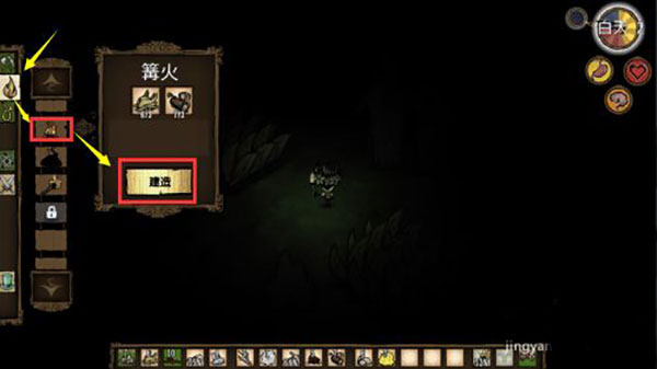 1、因?yàn)榛鸢颜彰鞣秶容^小,晚上天太黑盡量不要亂跑(防止跑到怪物點(diǎn)),生一個(gè)柴堆取暖即可。