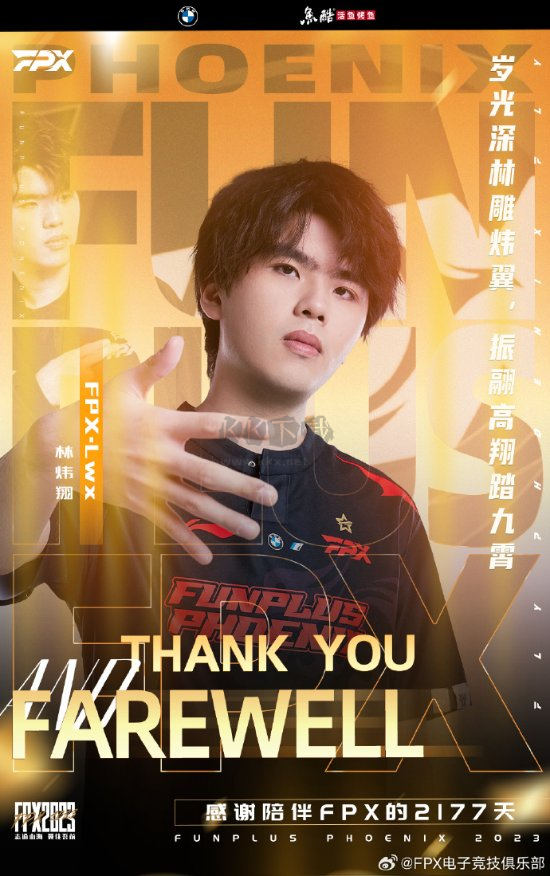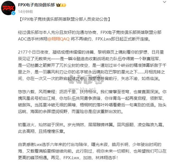 “由衷感謝Lwx選手六年來的付出與陪伴,曙光未寂,皓月長明,少年駛出時間的海,又載著滿船星輝繼續(xù)向前。此行別過,祝你未來一切順利,也希望我們可以在更高的峰頂相遇。再見,F(xiàn)PX.Lwx,加油,林煒翔選手!”