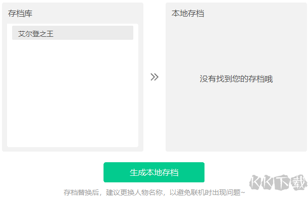 3. 左側(cè)展示存檔庫內(nèi)容,右側(cè)展示本地存檔,若您是新玩家,沒有存檔,那您選擇左側(cè)存檔庫中的存檔后,我們會自動幫您自動生成本地存檔,直接體驗一步成為埃爾登之王;